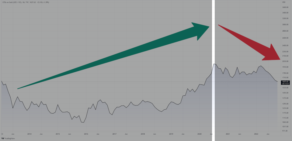 Dlaczego ci "guru" nie mówią Tobie, że złoto w ostatniej dekadzie rosło (podczas rekordowo niskiej inflacji), gdy obecnie (w trakcie rekordowo wysokiej) spada?
